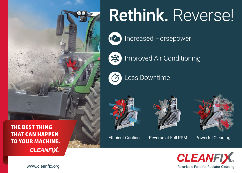 Cleanfix Reversible Fans are installed in a wide range of self-propelled equipment used in agriculture, waste and recycling, construction and forestry, among applications. These include tractors, harvesters, combines, sprayers and skid-steers that achieve maximum productivity and significant fuel savings with their maintenance-free, automatic radiator cleaning.